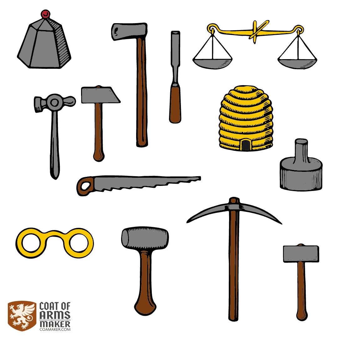 We have added 14 new tool symbols to our library! Three hammers, a chisel, a pick, a pick axe, a woodcutter’s axe, a weight, a stamp, spectacles, a new beehive, a new barrel, new scales, and a saw.